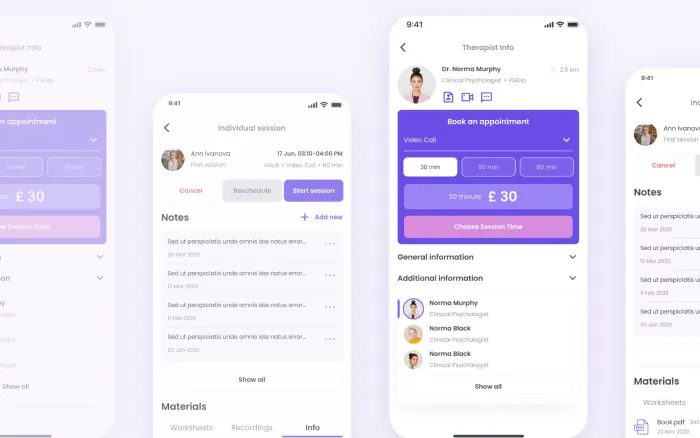 An accessible online platform that connects therapists and patients. We created an intuitive UI to help the app attract a wide audience. To make the service useful, our software developers integrated features like video calls, calendars, and more.